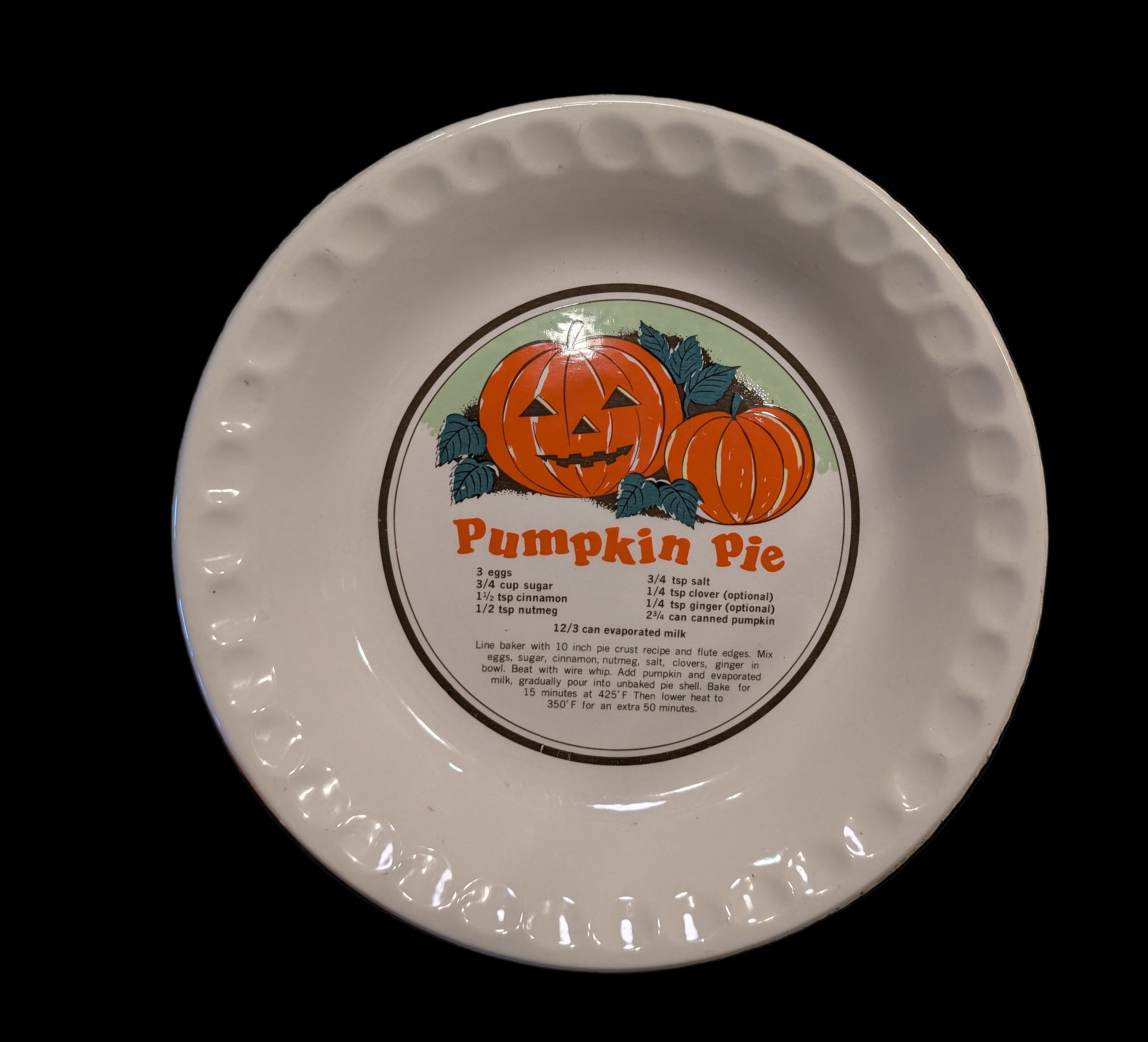 Pumpkin pie dish with recipe and carved pumpkin illustration