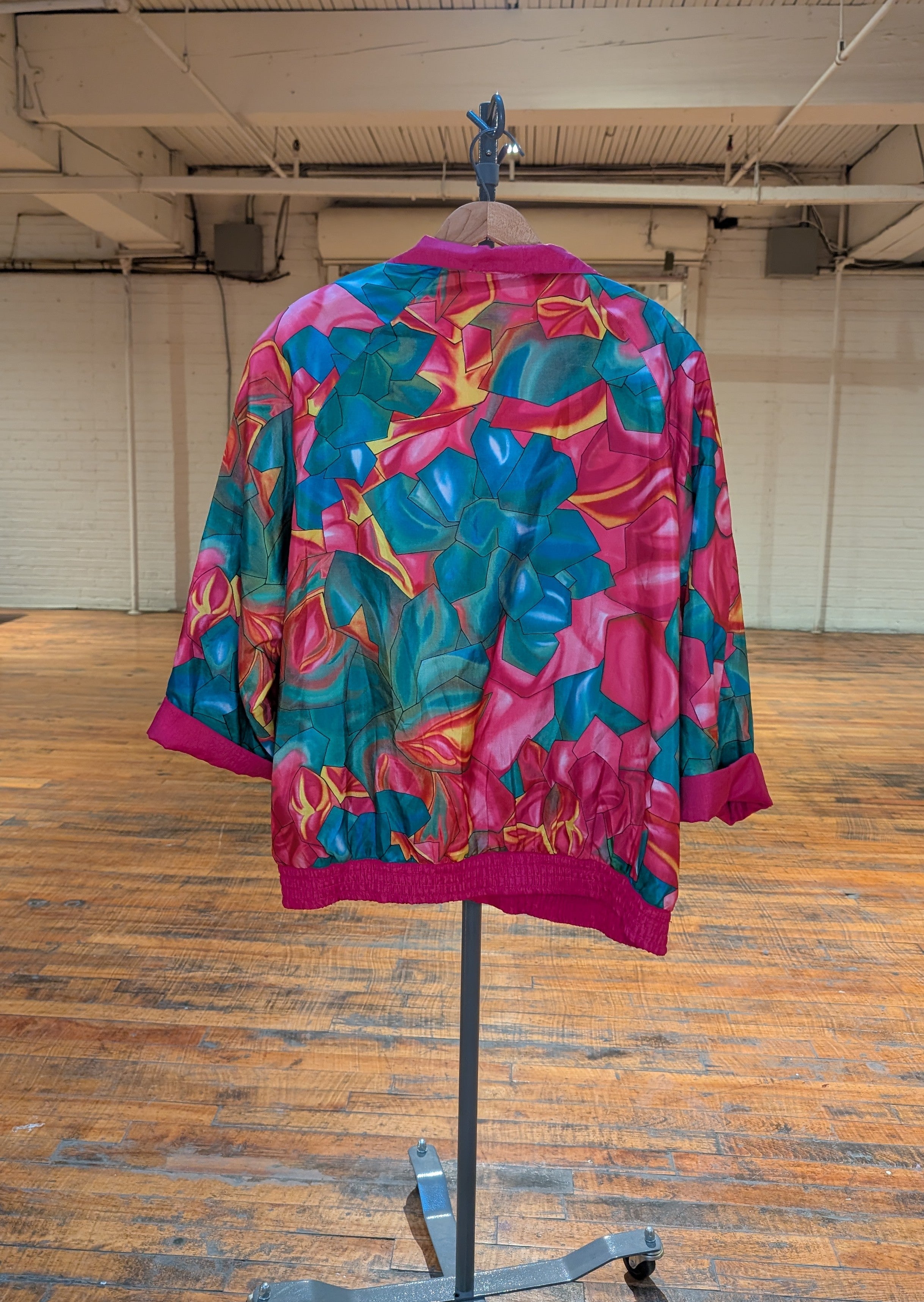 Reversible rosebud windbreaker fractured quartz floral design magenta, blue, and deep aqua