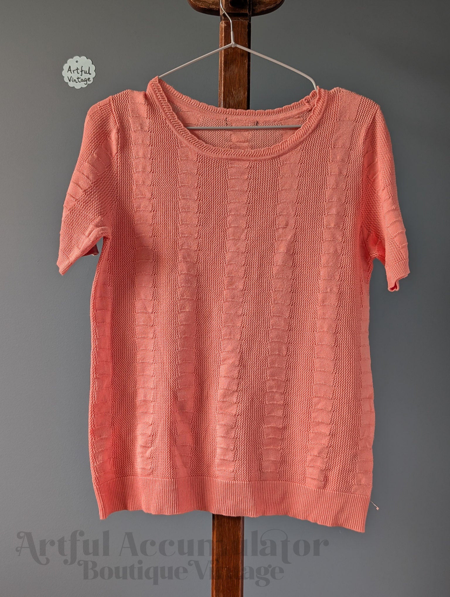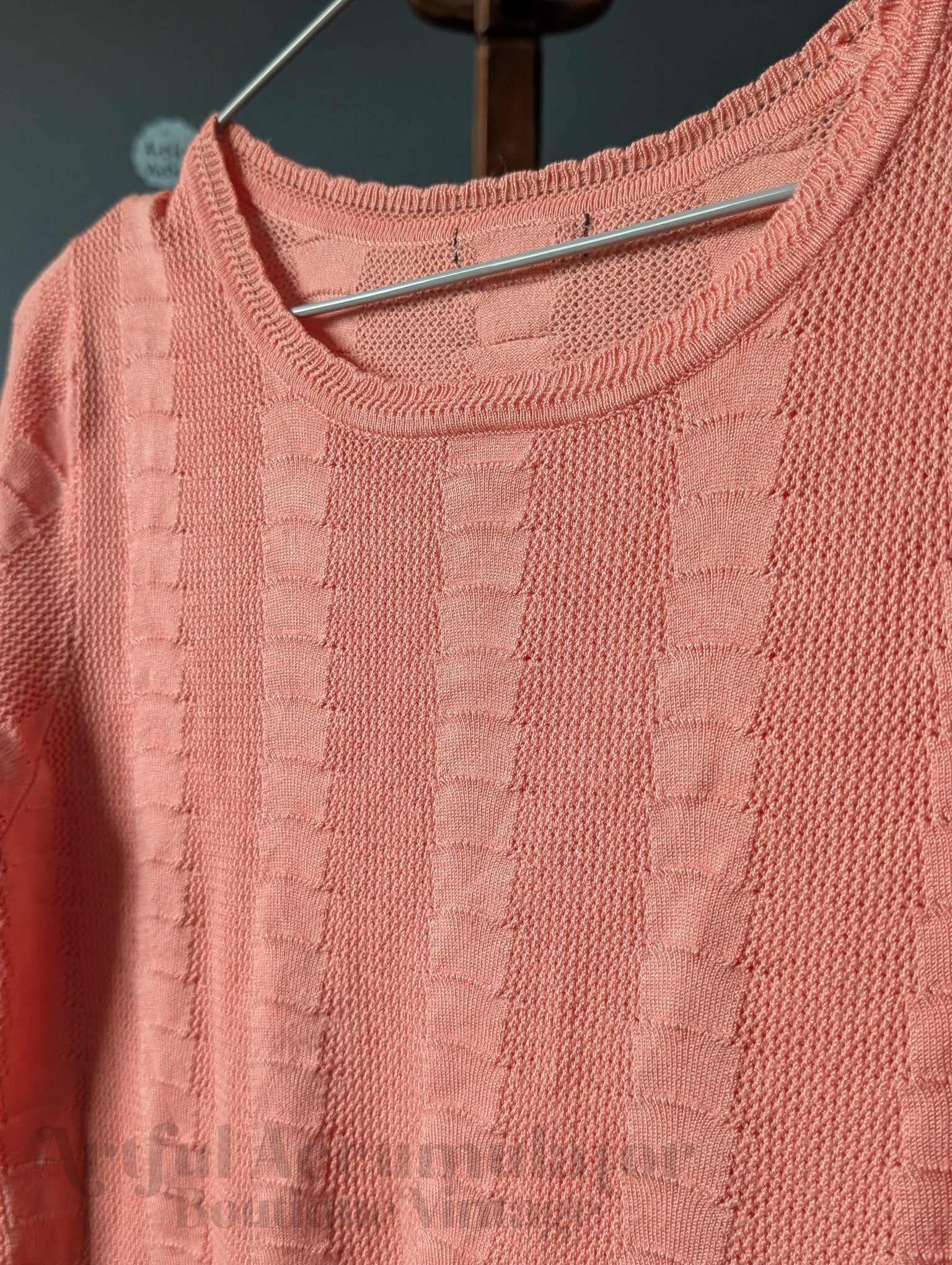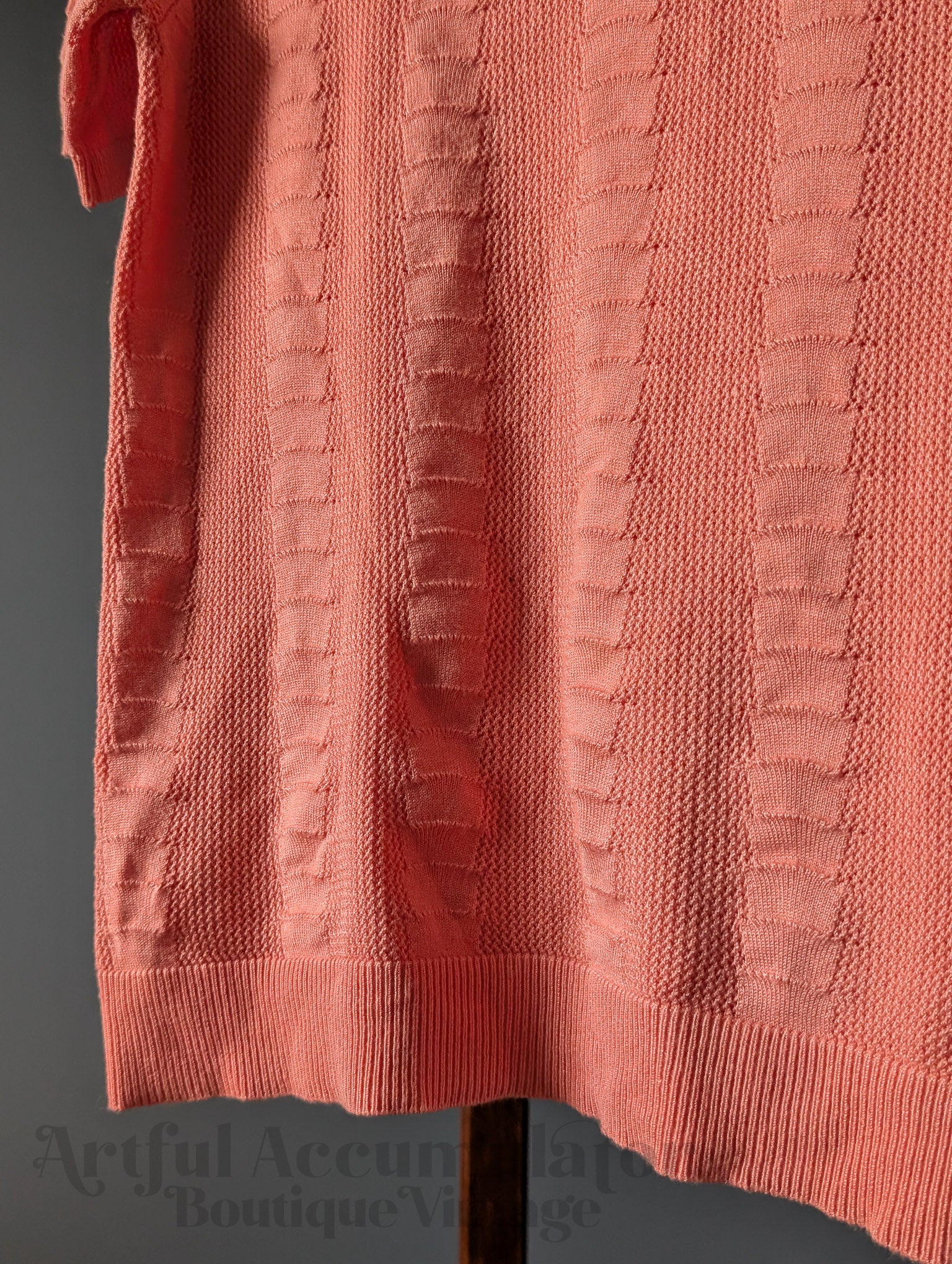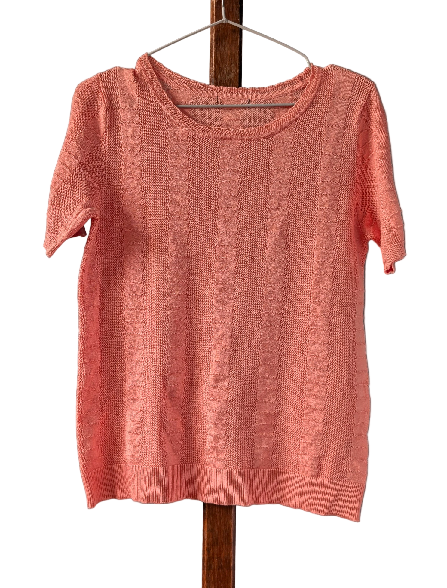 warm pink scalloped textured patterned knit shirt short sleeves, scalloped collar, brandless