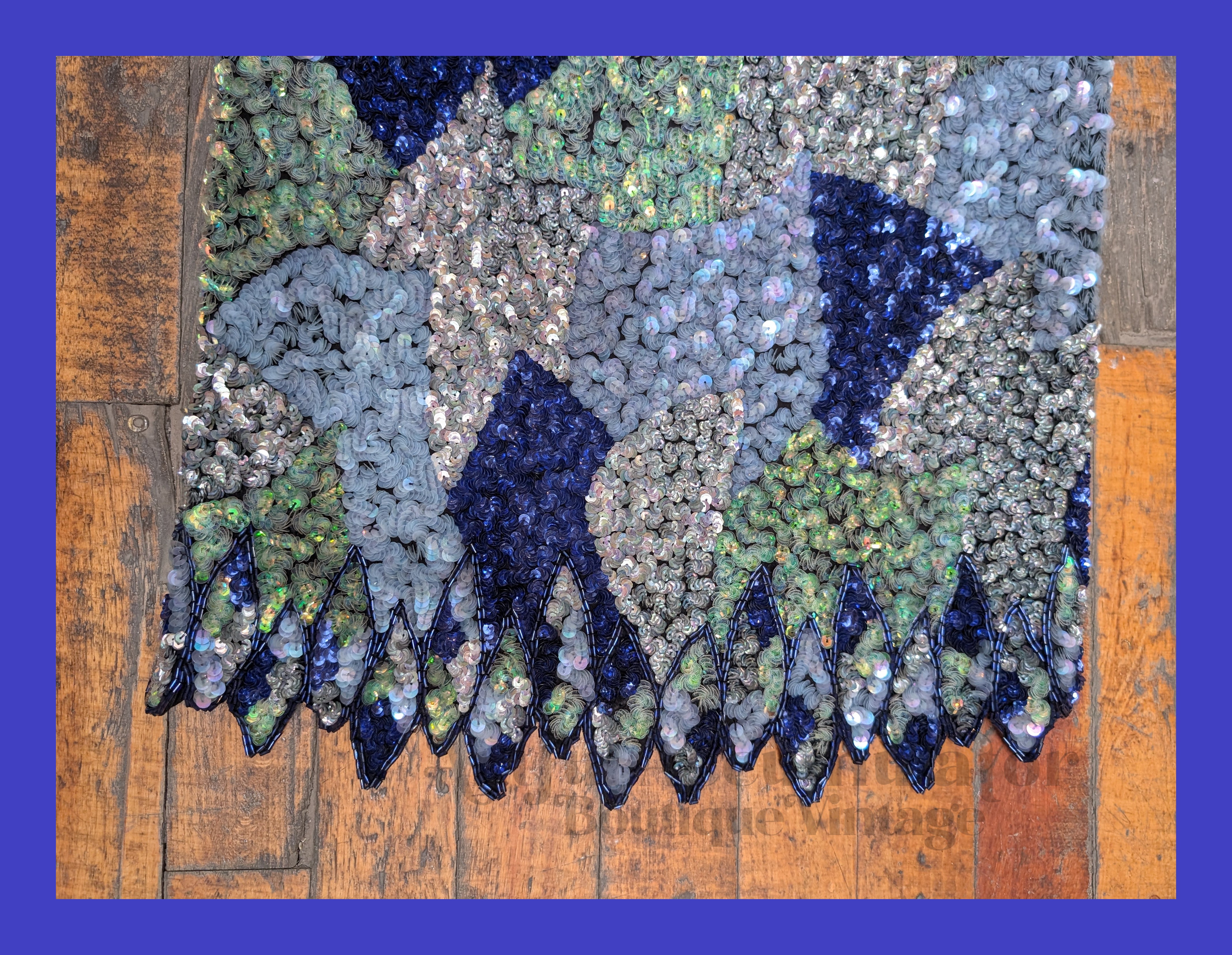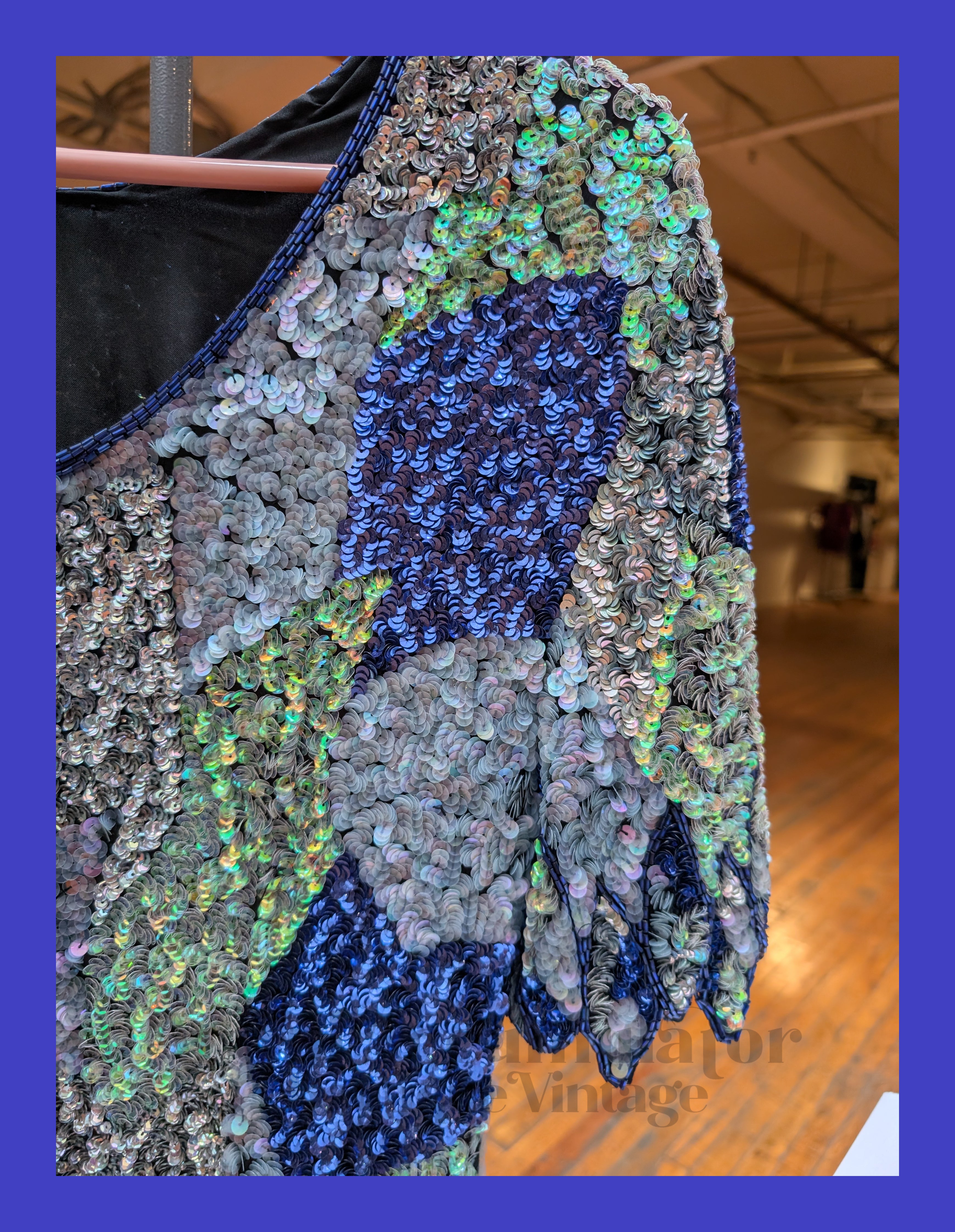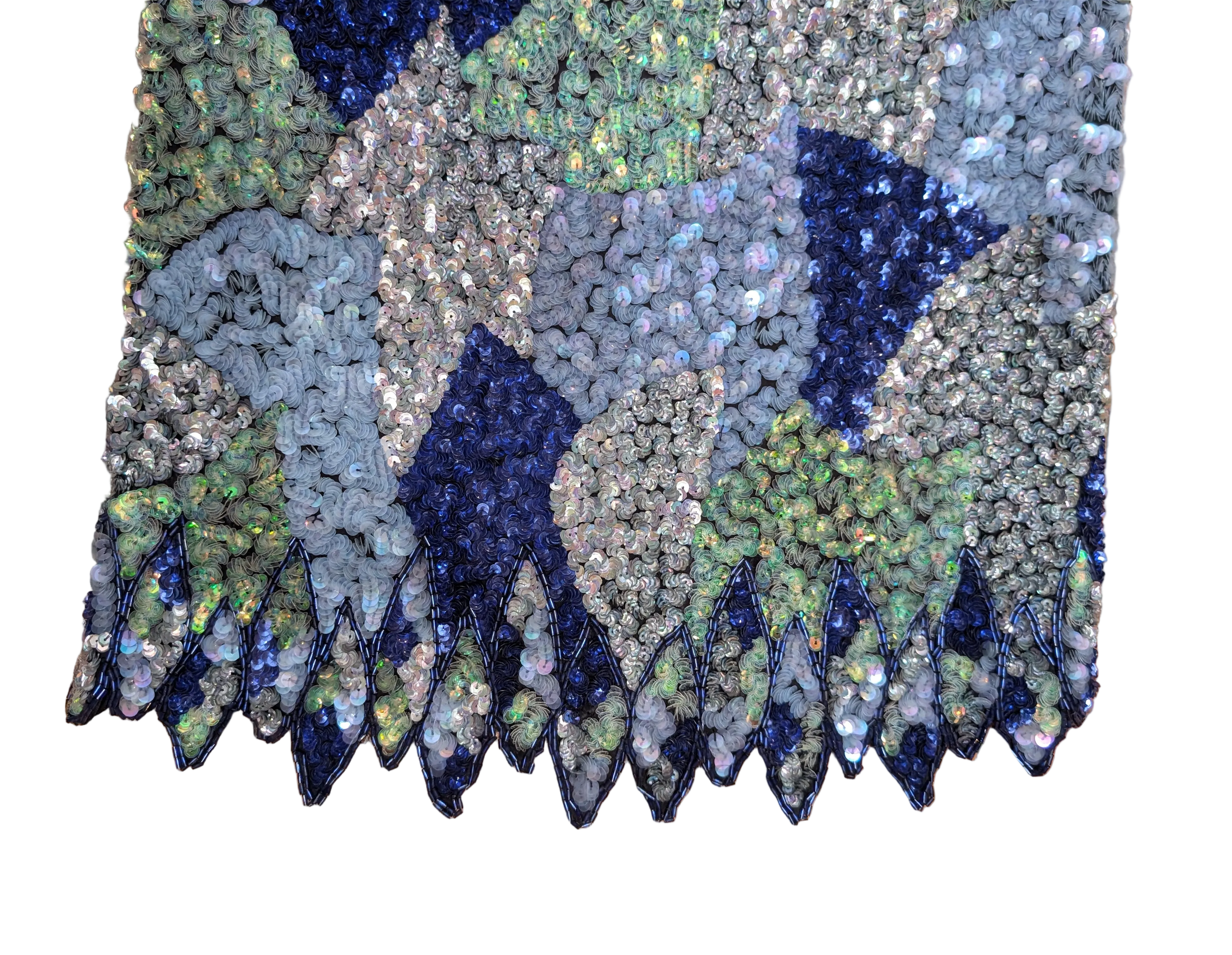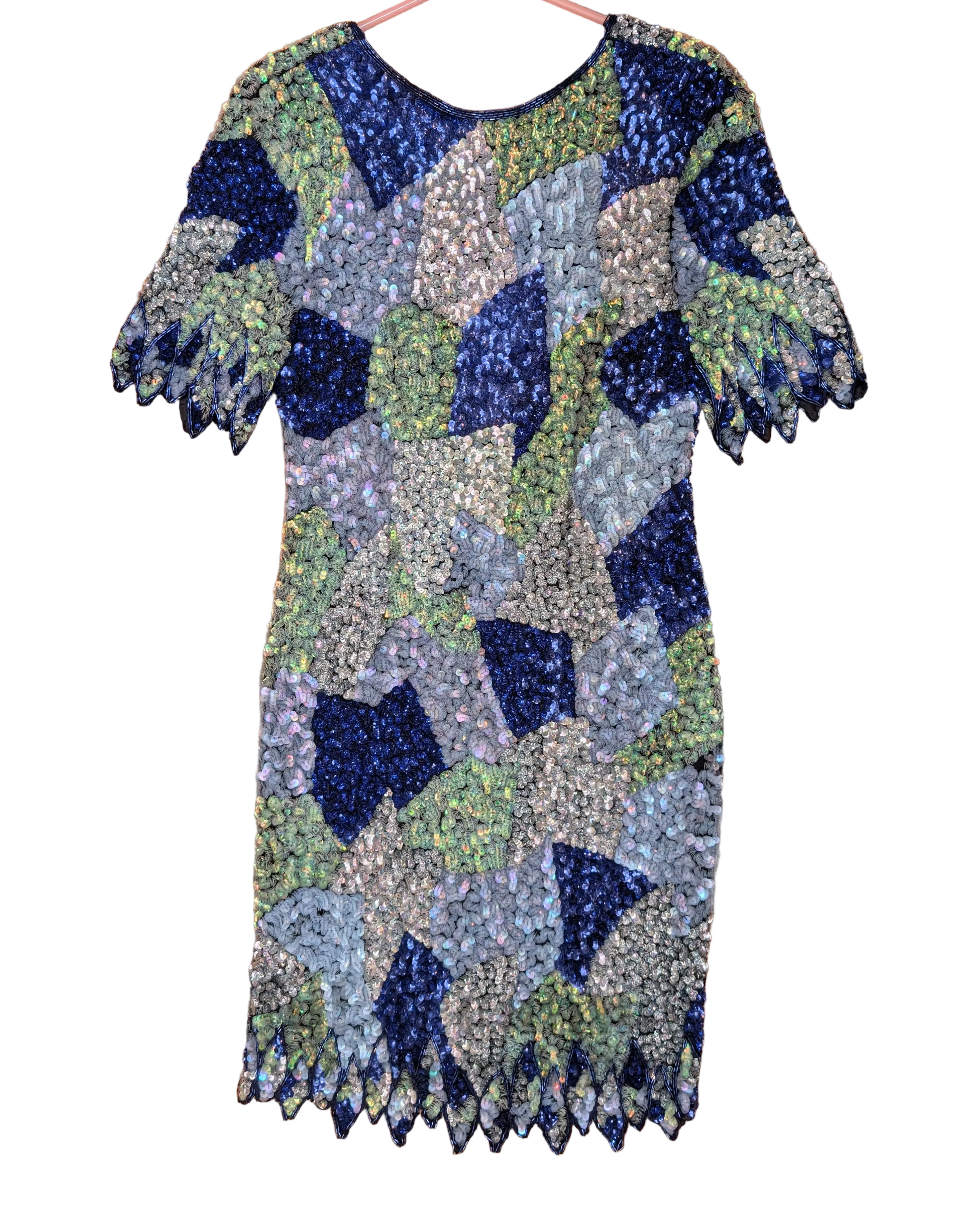 Dazzling sequin-covered party dress in sapphire, light green, silver, and dusty blue - extra small