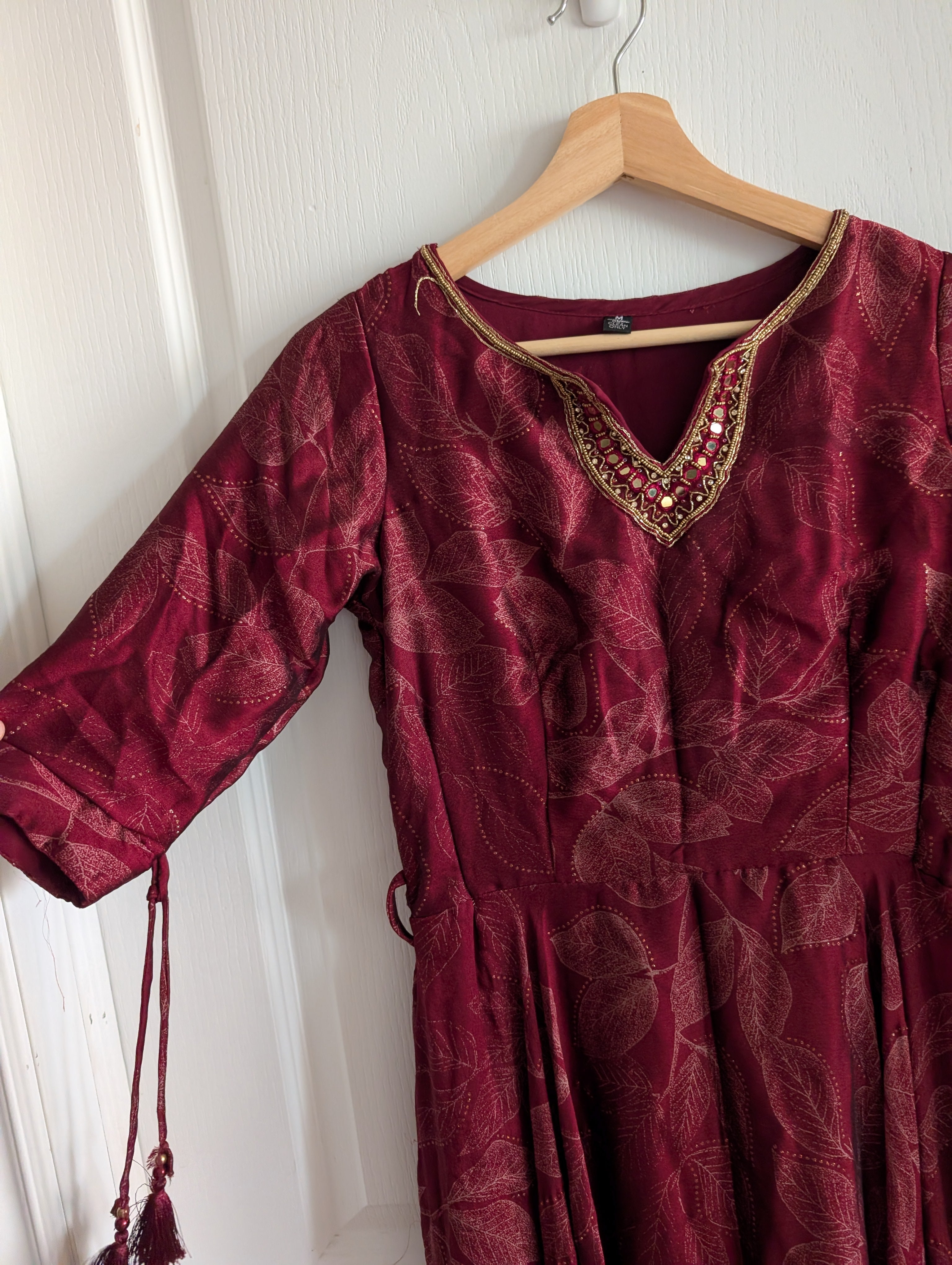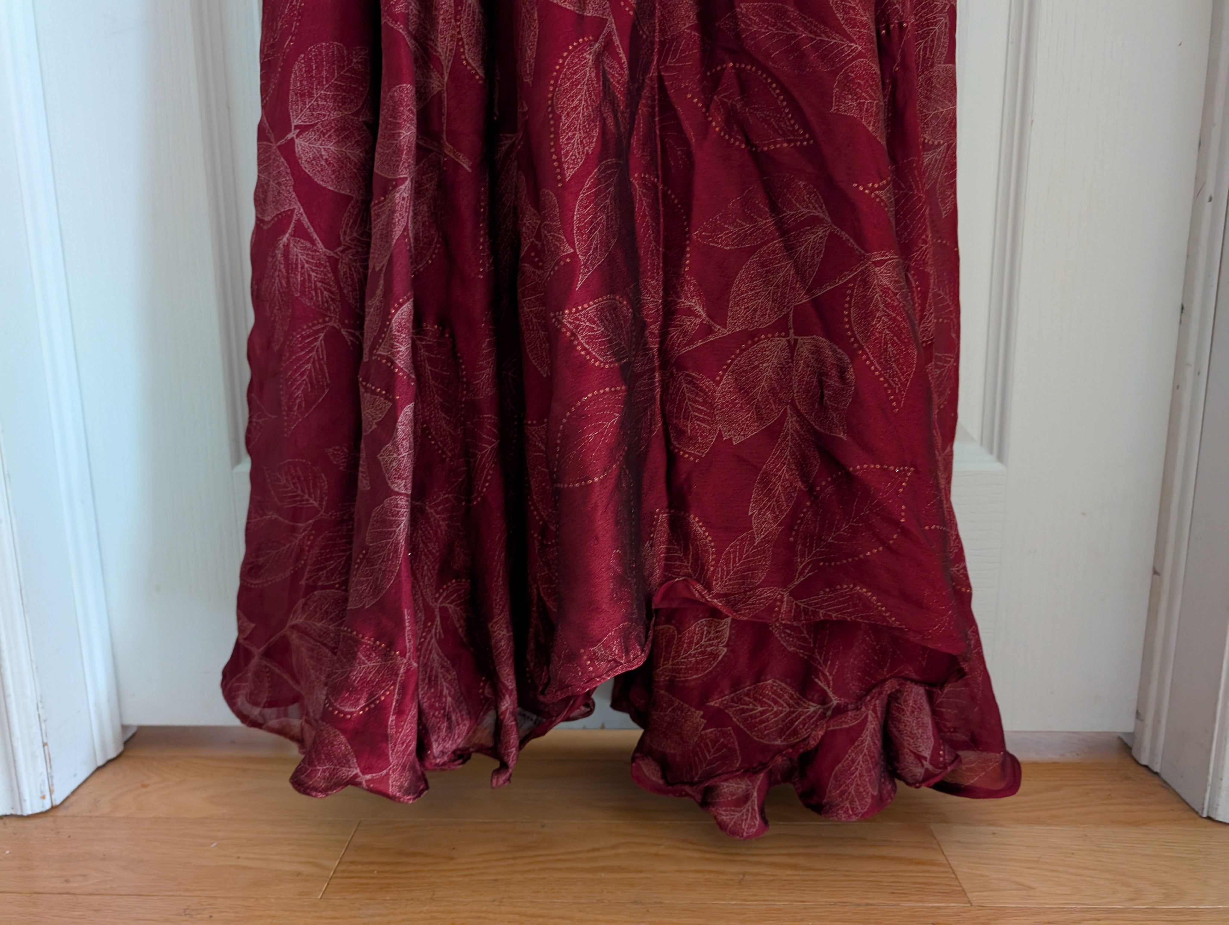 *sold out* Long dress crimson with circle skirt, gold leaves