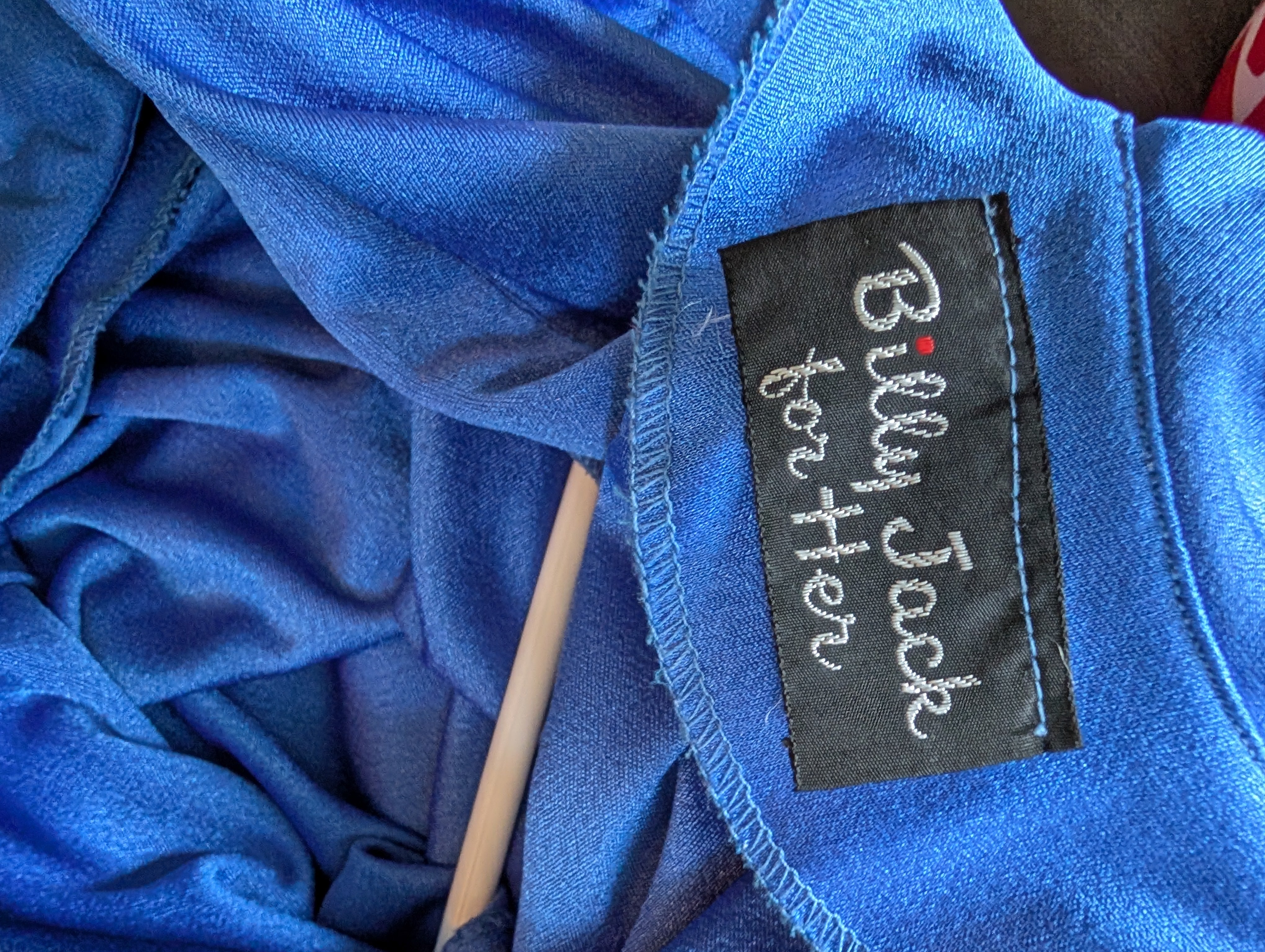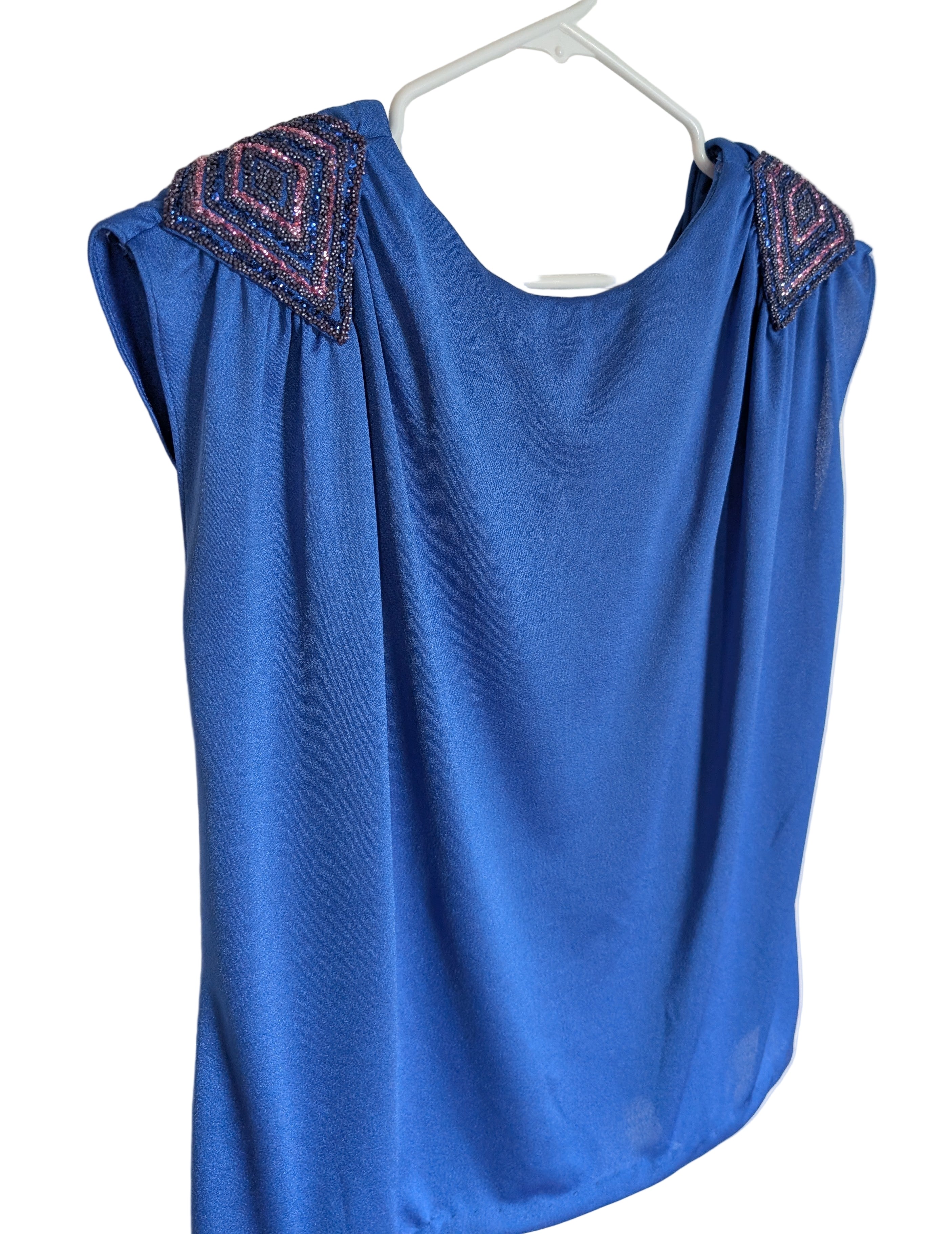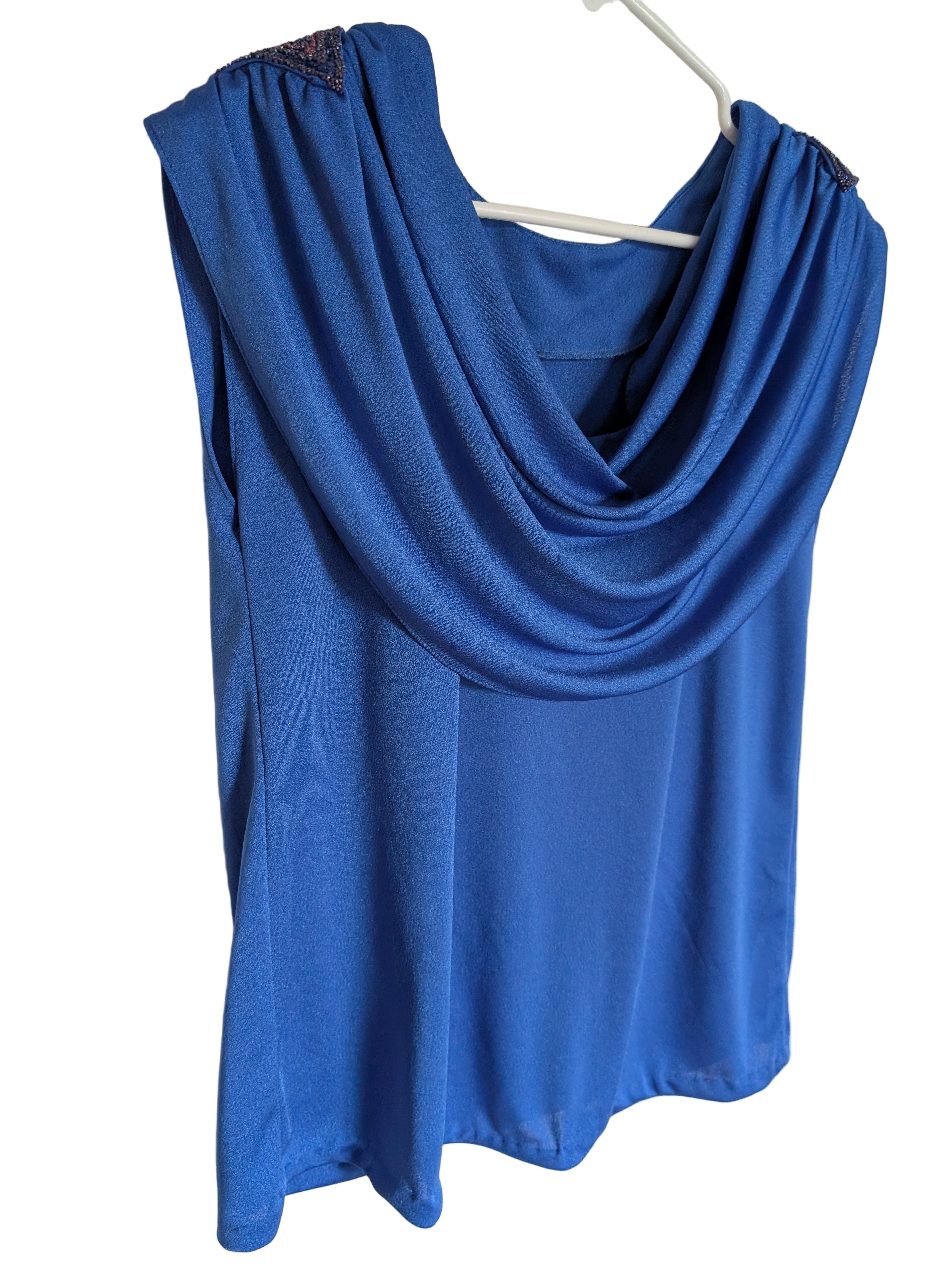 Cobalt Blue blouse with glittery blue shoulder pads and draped back