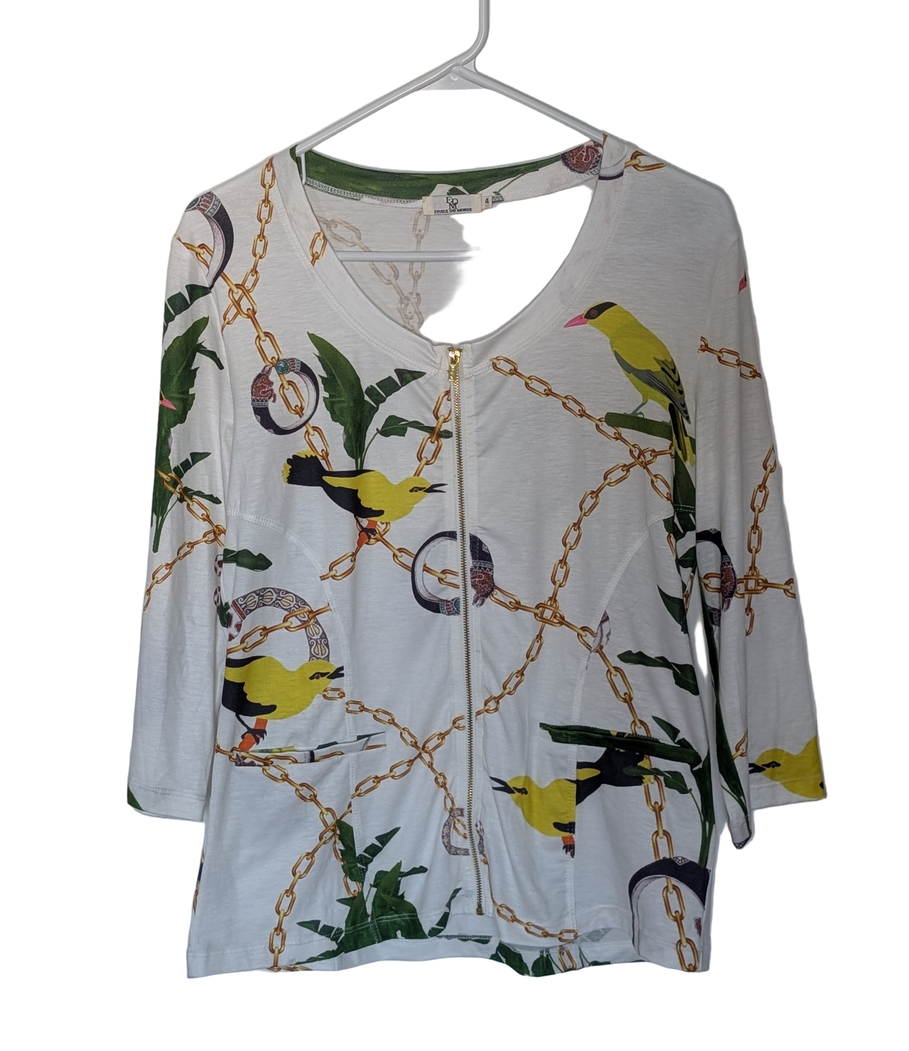 Modern * white zip up cardigan with imagery of jewels, gold chains, and yellow birds