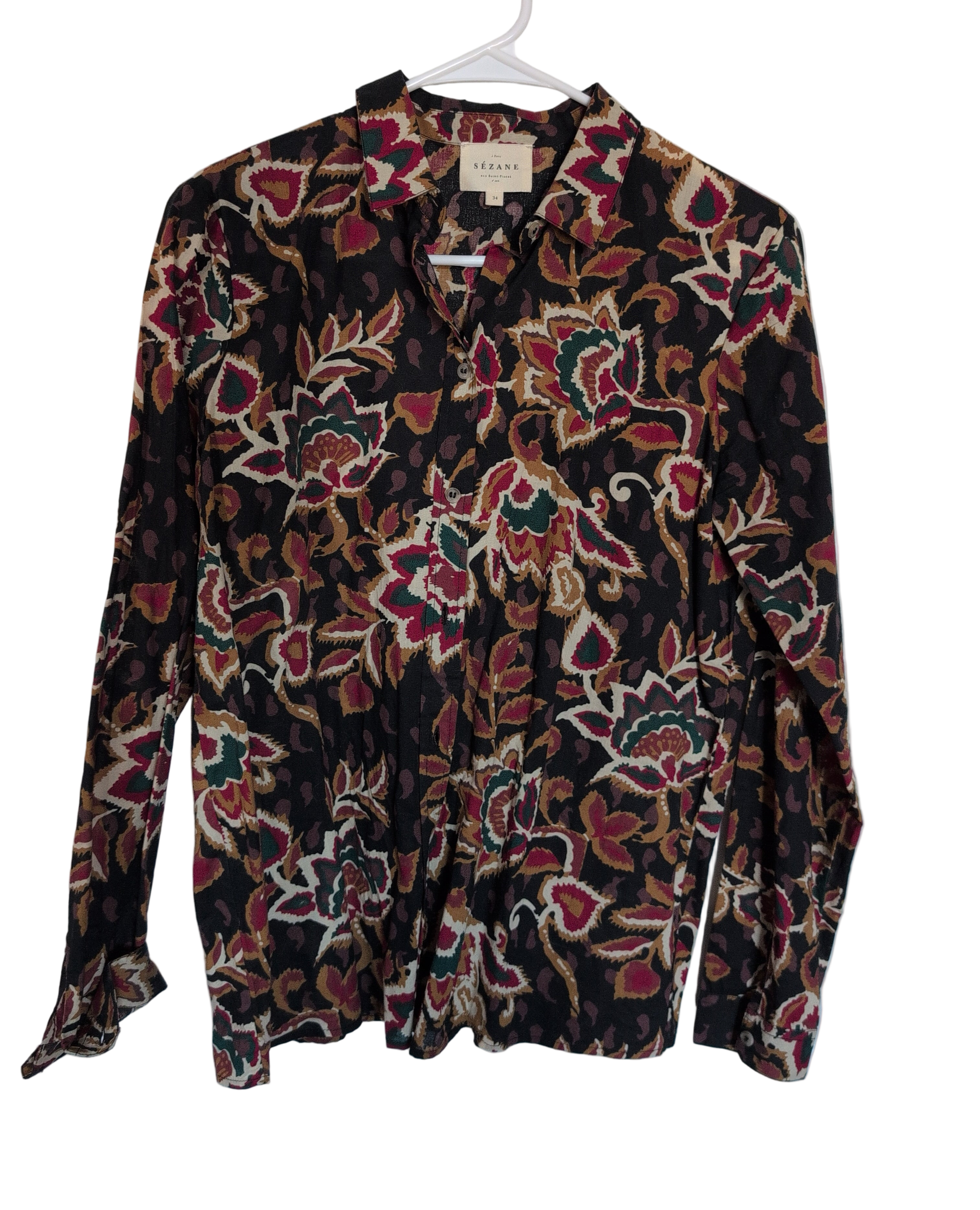 autumnal floral and leaf pattern, long sleeve button up shirt blouse, size 34