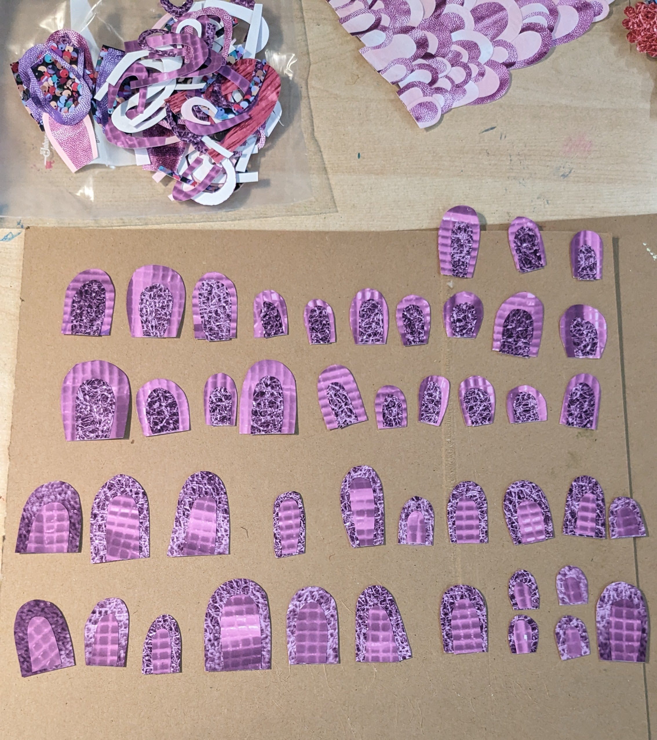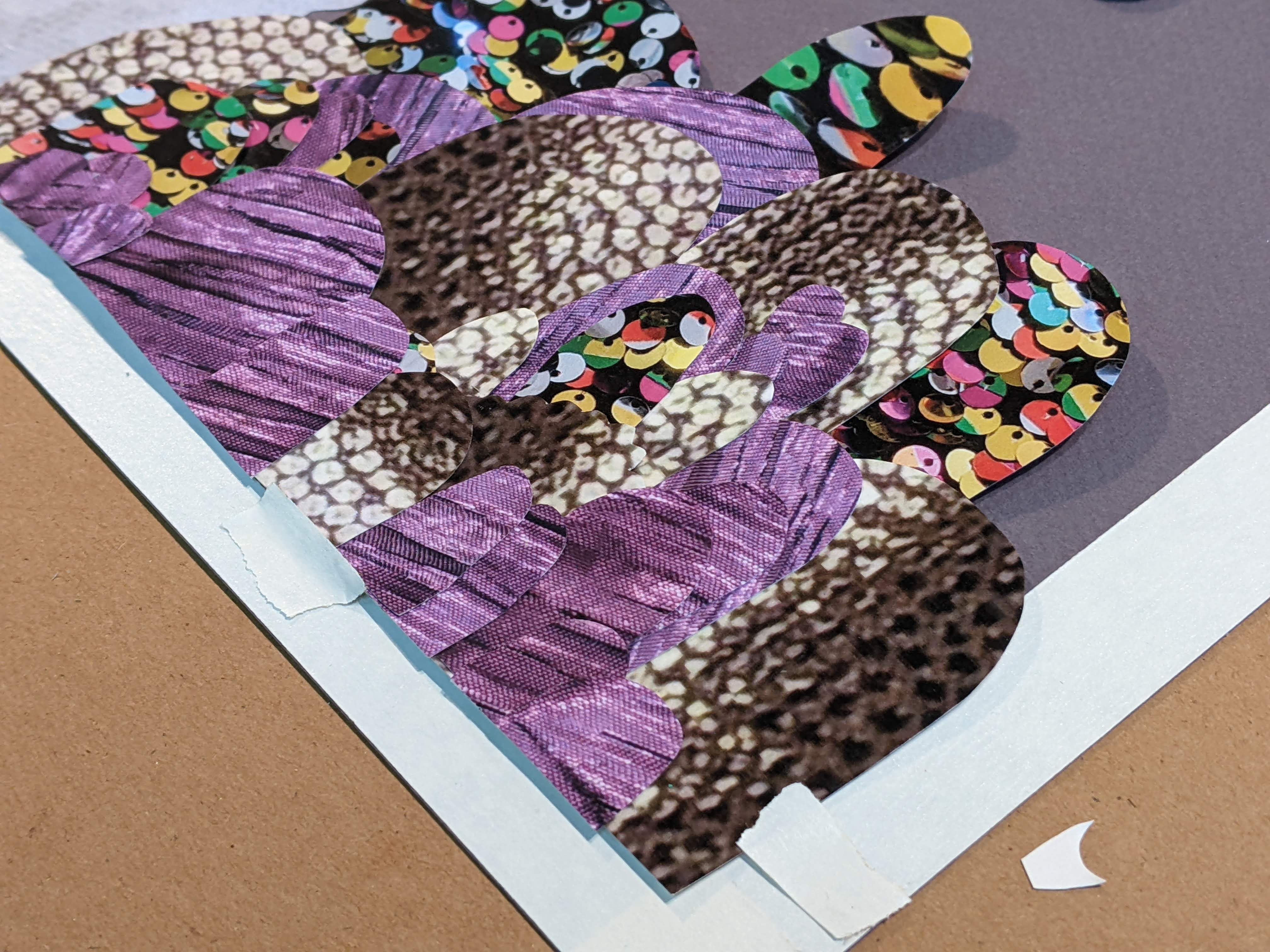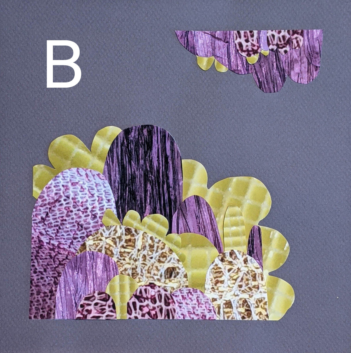 These are cut paper collages using imagery of fabric patterns, textures, and designs. The fabric is manipulated, photographed, sometimes digitally colorized, and printed on archival matte paper. Shapes are then cut and arranged to create visual tension (or relief).